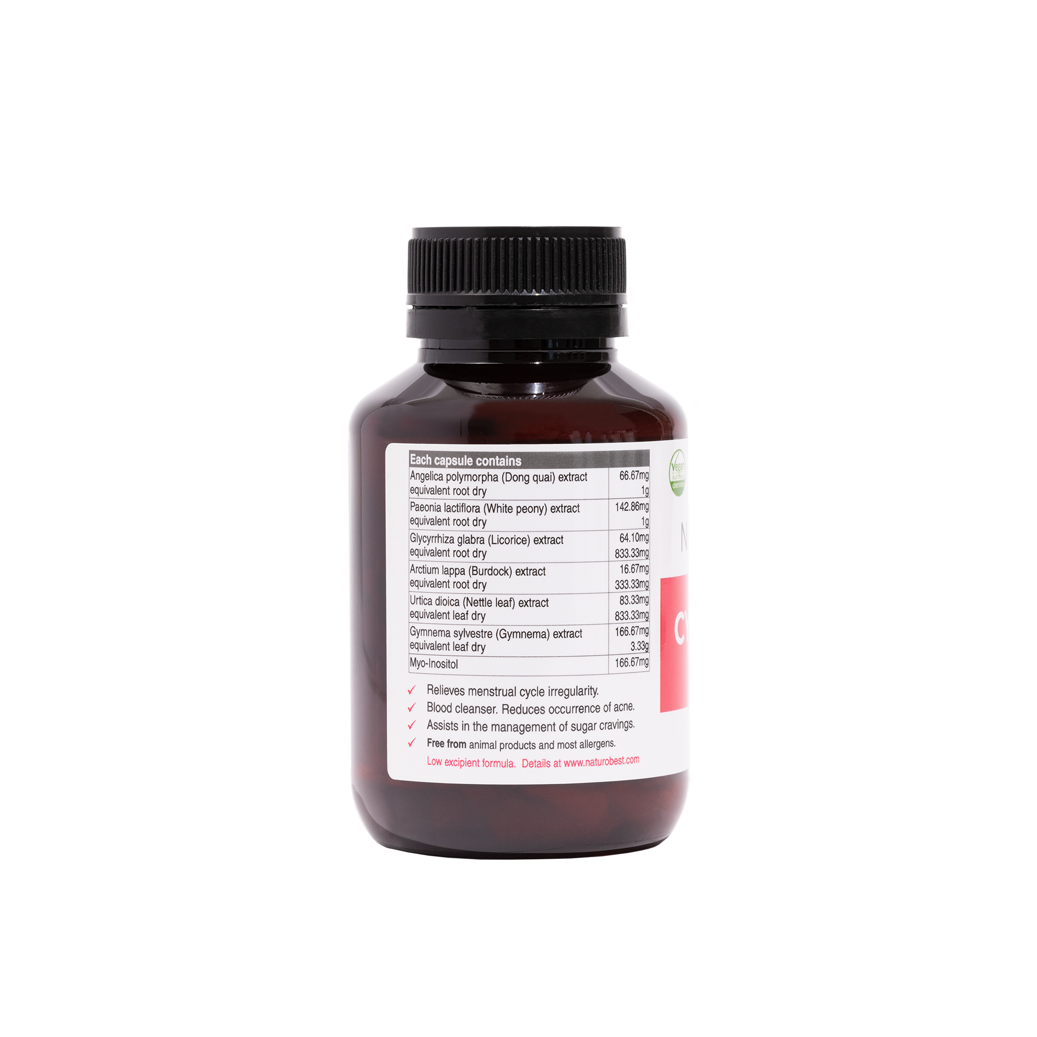 NaturoBest's Cycle & Skin Support is vegan-friendly, free from animal products, dairy, egg, fish/shellfish, gluten, lactose, msg, nuts, soy, oats and other grain derived ingredients, peanuts, sulphites, sucralose, wheat, yeast, magnesium stearate, stearic acid, microcrystalline cellulose, ascorbyl palmitate, titanium dioxide and other artificial colors, flavors and preservatives. Our Cycle & Skin Support is also GMO free and free from many other allergens, please contact us to find out more.