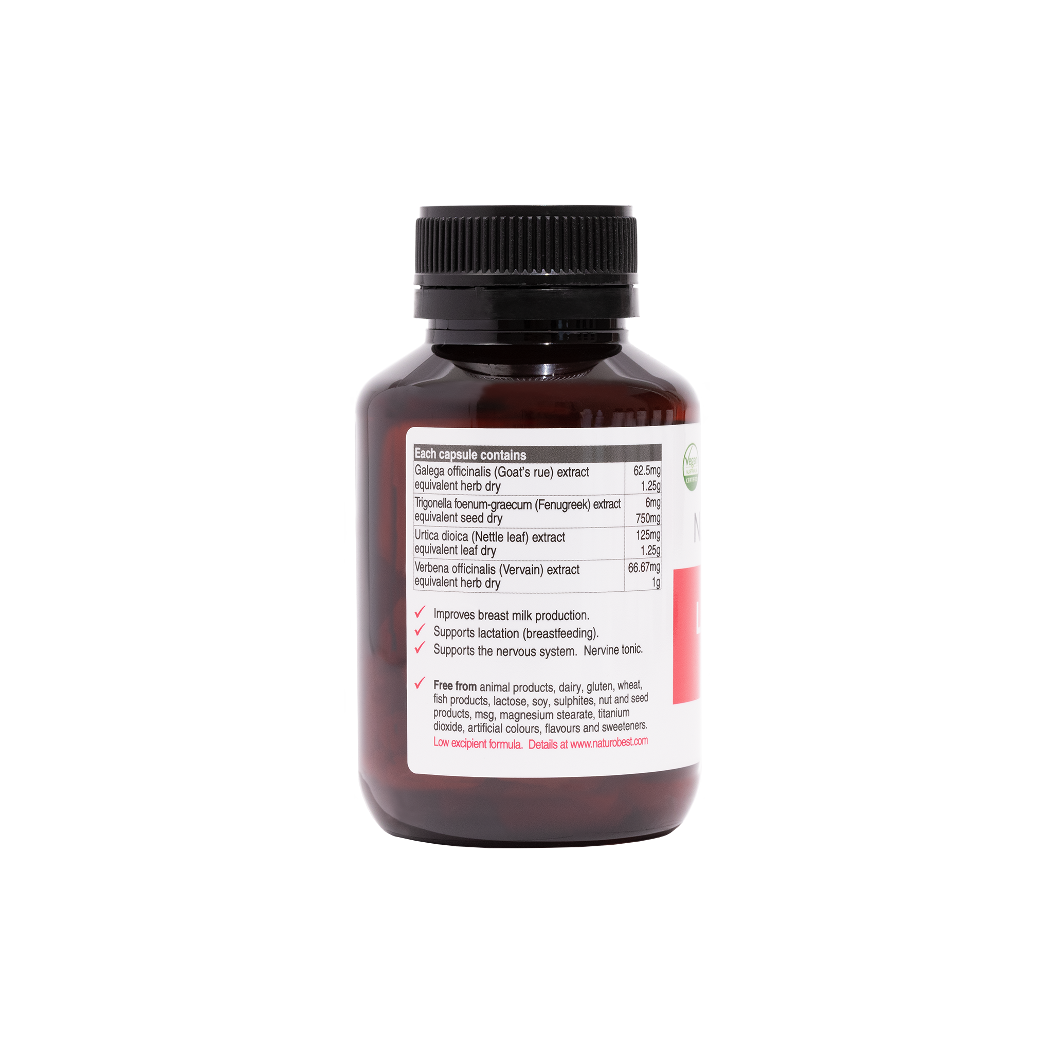 NaturoBest's Lactation Support is vegan-friendly and completely free from animal products, soy, dairy, egg, fish/shellfish, gluten, lactose, MSG, nuts, oats and other grain-derived ingredients, peanuts, sulphites, sucralose, wheat, yeast, magnesium stearate, stearic acid, microcrystalline cellulose, pine, titanium dioxide and other artificial colors, flavors, and preservatives.