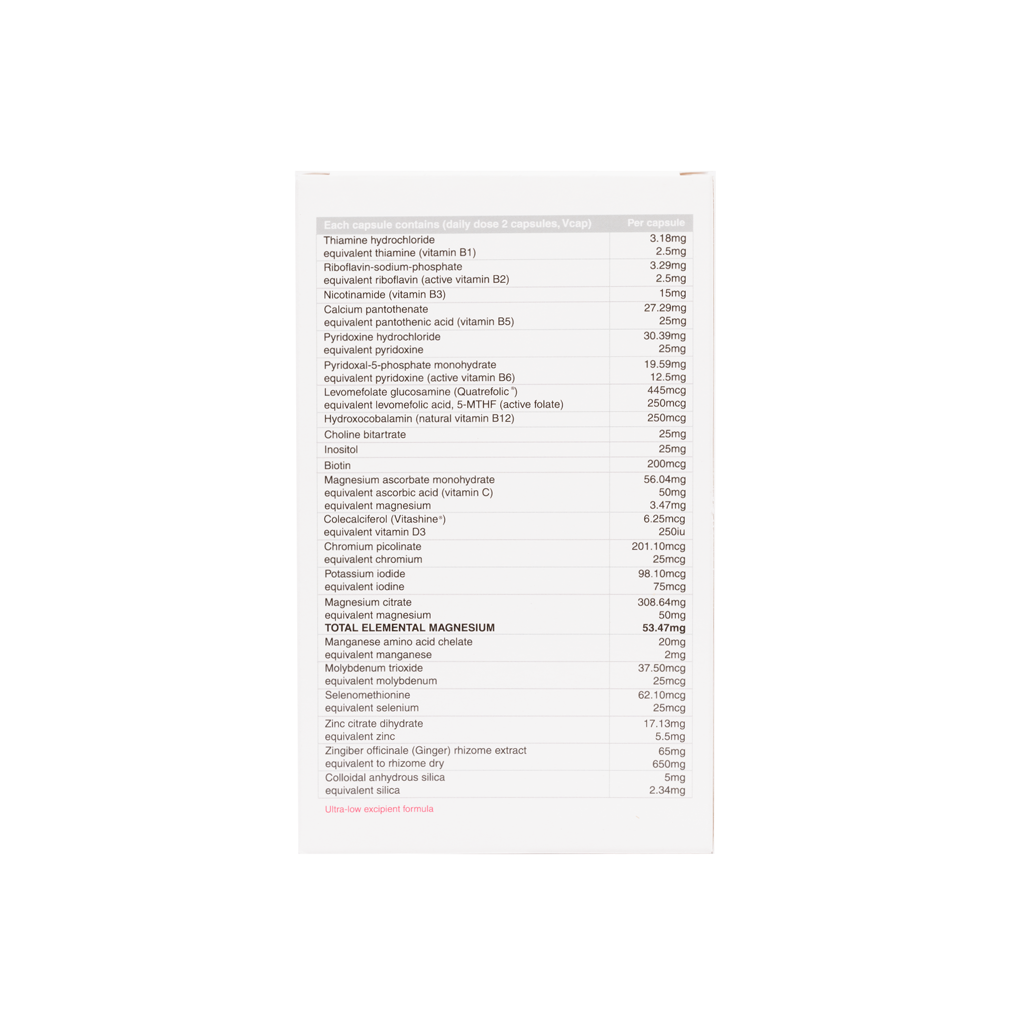 Provides active forms of vitamins B2, B6, B12 and folate and is free from copper. This is an ultra-low excipient formula.