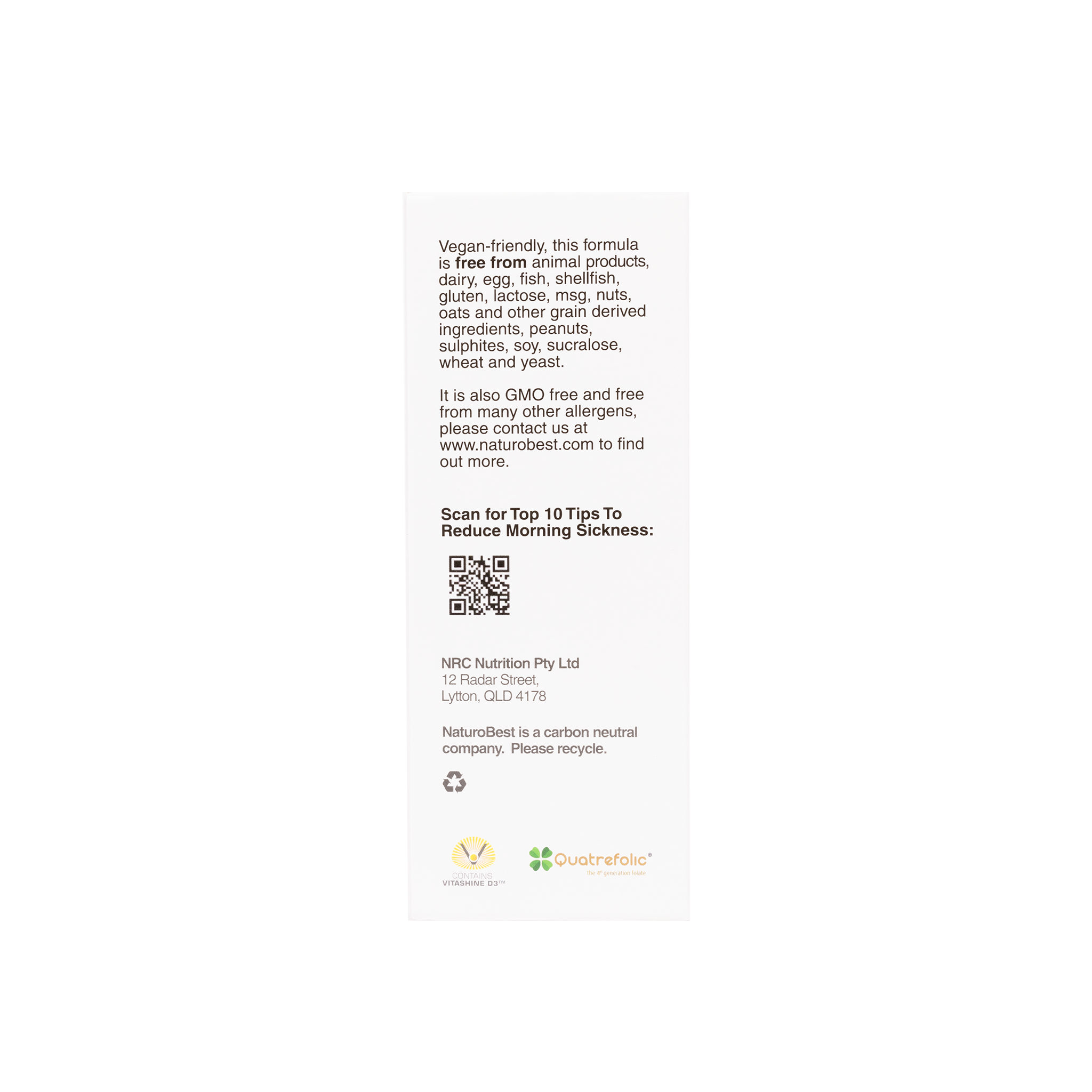 Vegan-friendly, this formula is free from animal products, dairy, egg, fish/shellfish, gluten, lactose, msg, nuts, oats and other grain derived ingredients, peanuts, sulphites, soy, sucralose, wheat, yeast, magnesium stearate, stearic acid and artificial colors, flavours and preservatives. This prenatal vitamin is also GMO free and free from many other allergens, please contact us to find out more.